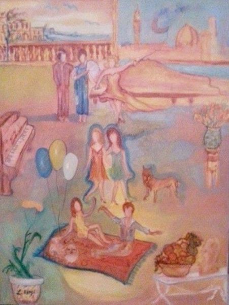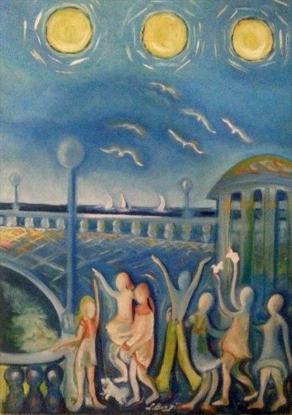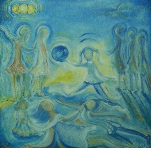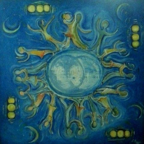I colori seguono linee che sembrano a loro volta ritmate nelle singole metafore delle liriche, dipingendo un affresco potente di ricerca interiore che evolve dal centro proiettandosi all'infinito, quella massa indefinita definente, ove il possibile si risolve nell'immediatezza di un attimo dove la meraviglia della bambina riesce a colpire l'attenzione della Luna. Mi piace proiettarmi in questa scena e osservare il dialogo tra Sorella Luna e la bambina (in questa vedo l'artista che in una sorta di simbiosi accomuna in sé la sua individualità a quella della nipotina, ove la purezza è sinonimo di grandezza). La Luna è imprescindibile compagna di giochi di noi tutti bambini spersi nel mondo della Fantasia prestata all'Ego intriso di forte valenza creativa: rappresenta la parte umbratile di ogni viaggio di iniziazione volto al raggiungimento del centro motorico dell'Essere ove l'Essere – per – la – Morte diviene il movimento che converge nell'affermazione del talento. La luna è il limite che ha senso e dà senso perché non potrebbe sussistere il Sole se non vi fosse questa compagna che, nell'oscurità delle notti dal cielo plumbeo, rende attiva la fiamma della speranza.