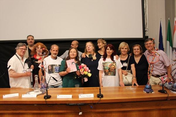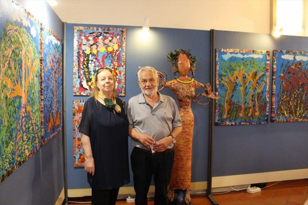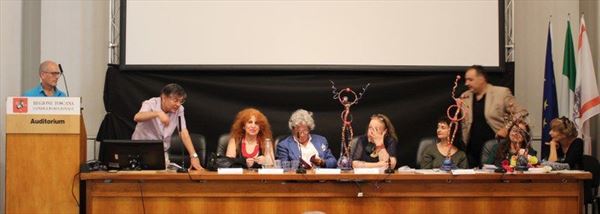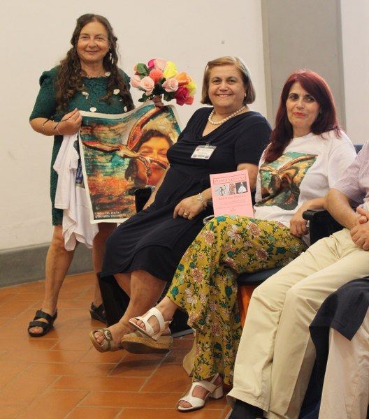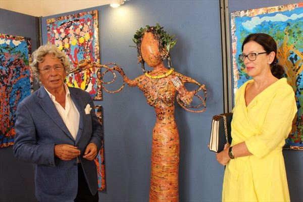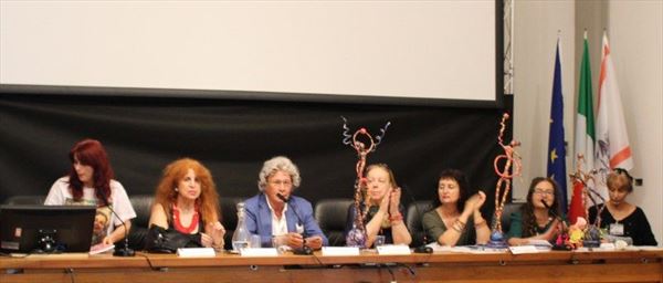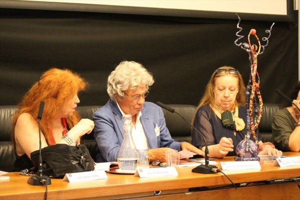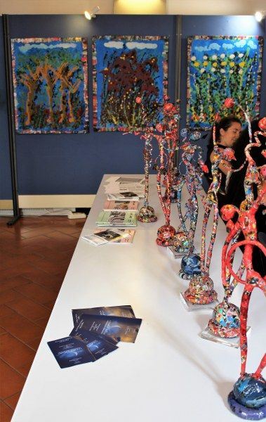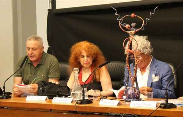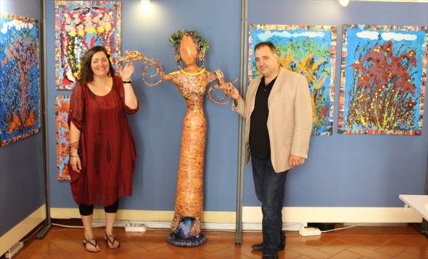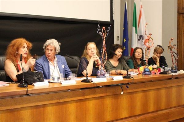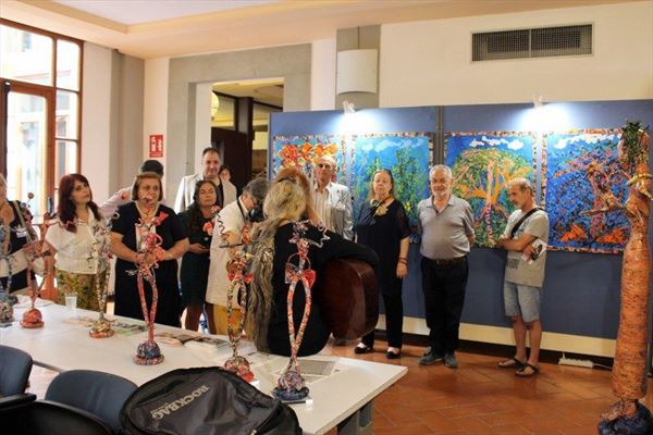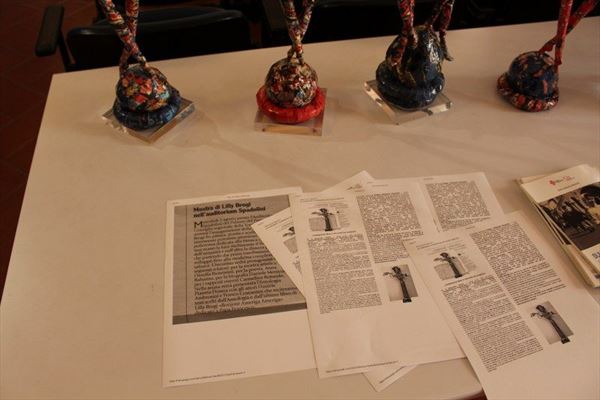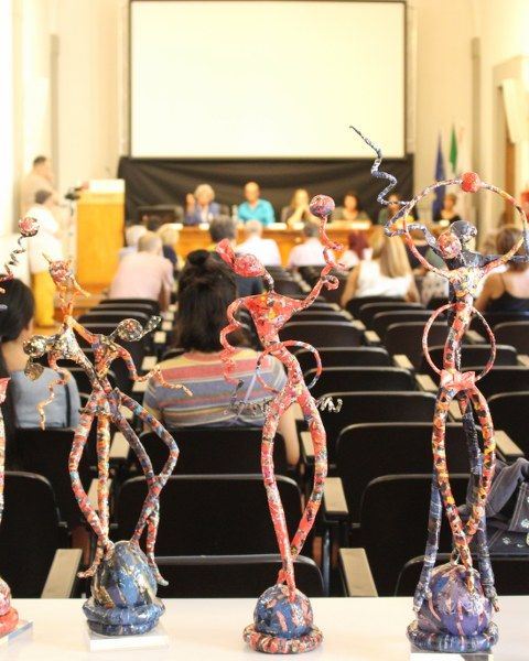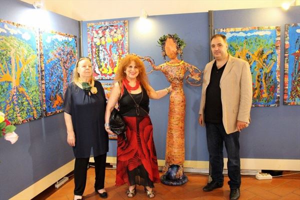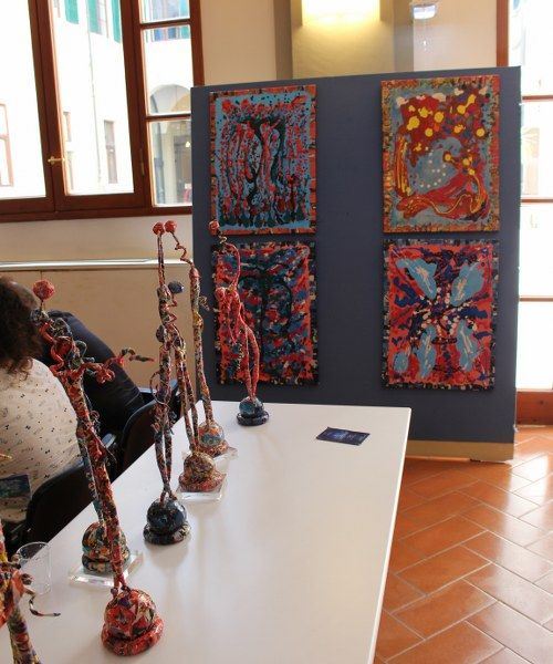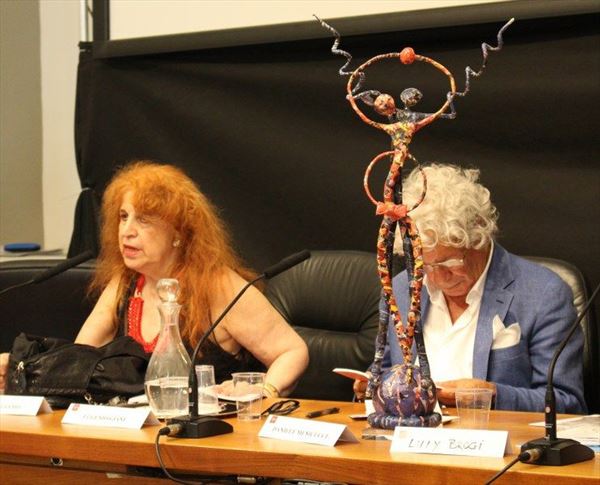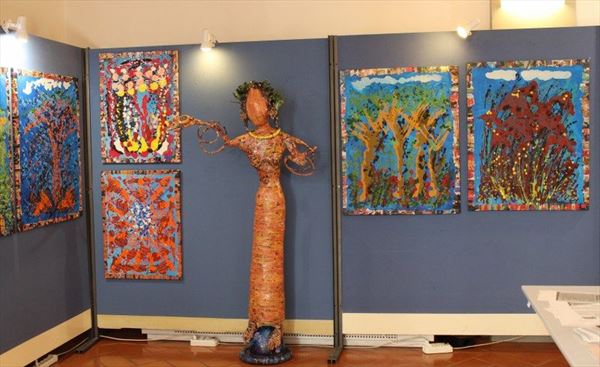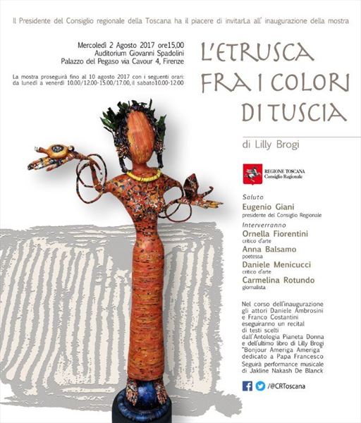Inaugurata il 2 agosto 2017 a Palazzo del Pegaso, nell’auditorium Spadolini con il patrocinio della Regione Toscana, l’originale mostra “L’Etrusca tra i colori della Tuscia” propone quattordici sculture in cartapesta e sedici dipinti con tecnica mista di Lilly Brogi, poliedrica artista appartenente al miglior panorama figurativo italiano dei nostri giorni. Imponente, con i suoi centottantacinque centimetri di altezza, spicca per fulgida grazia la policroma Etrusca. Chiaro esempio di maestria scultorea di matrice popolare, è costituita da materiali poveri quali il ferro, il legno, la colla e la carta. La linea curva, arabescata, di derivazione floreale è presente nelle braccia dell’intrigante e misteriosa donna che, indomita, ha attraversato il tempo e lo spazio per giungere fino a noi. Testimonia il legame indissolubile con la civiltà etrusca distintasi, tra l’altro, per il ruolo preminente attribuito alla donna nella società dell’epoca e l’immediatezza espressionistica presente nelle arti figurative. Da un punto di vista scultoreo, evidenzia altresì l’attualità della tradizione avanguardistica del primo Novecento che predilige la linea sinuosa e armonica, presente in natura, da coniugarsi con l’abilità della costruzione plastica. Lo Stile Floreale, che si ispira anche alla pittura lineare giapponese, tende a superare l’antinomia tra la nascente industria e l’arte al fine di abbellire la vita quotidiana. Le braccia dell’Etrusca ci recano l’incanto della bellezza che salva il mondo dalla barbarie e dal fango. Nella mano sinistra porge una piccola casa antica che auspica il processo evolutivo dell’architettura a misura non solo dello spazio fisico, ma anche della nostra dimensione interiore. Nella mano destra tiene una lampada ad olio che rappresenta la luce della conoscenza. L’Etrusca reca in sé un messaggio d’amore: si deve imparare dagli esempi della Storia per non ricadere negli stessi errori. Elemento sostanziale, che dona un senso di immanente, leggiadra maestosità alla statua di cartapesta, sono gli splendidi piedi prensili che si appoggiano sull’azzurro globo terracqueo. L’essenza della femminilità, intesa come valorizzazione dell’intelligenza della grande madre dispensatrice di pace e prosperità a tutta l’umanità, rappresenta parte della prodiga poetica artistica di Lilly Brogi, che mira all’elevazione spirituale. Nella parte inferiore del corpo, si aprono quindi infiniti scenari di valenza cosmica in cui l’Etrusca, che è Donna, indica la via della salvezza dalle umane sofferenze. Deliziose creature, in bilico tra Terra e Cielo, sono le sculture di piccole dimensioni. Se, con l’Etrusca, condividono la pregnanza materica dell’arte povera, se ne distaccano anch’esse levando le snelle braccia al cielo per giocare a palla con la luna o prendere le stelle. L’eleganza insita nelle linee curve si compenetra all’audacia delle diagonali e dei piani inclinati quando, in particolar modo, l’opera è composta da due figure che si uniscono in un abbraccio. Ideale e sincero, fuga ombre e solitudine per l’eternità. L’afflato mistico è insito nell’arte di Lilly Brogi che persevera a mostrare fede e fiducia in piani astrali intuibili e prossimi solo a coloro che umilmente si avvicinano alla verità rivelata tramite la consapevolezza di poter incontrare, strada facendo, un angelo nel clochard dell’angolo o nell’anziano solo o nel bambino portatore di handicap.