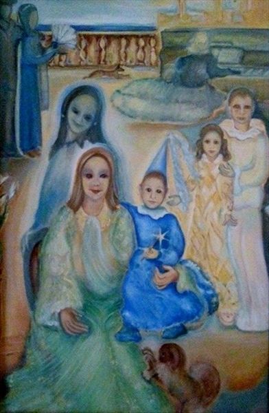 I colori seguono linee che sembrano a loro volta ritmate nelle singole metafore delle liriche, dipingendo un affresco potente di ricerca interiore che evolve dal centro proiettandosi all'infinito, quella massa indefinita definente, ove il possibile si risolve nell'immediatezza di un attimo dove la meraviglia della bambina riesce a colpire l'attenzione della Luna. Mi piace proiettarmi in questa scena e osservare il dialogo tra Sorella Luna e la bambina (in questa vedo l'artista che in una sorta di simbiosi accomuna in sé la sua individualità a quella della nipotina, ove la purezza è sinonimo di grandezza). La Luna è imprescindibile compagna di giochi di noi tutti bambini spersi nel mondo della Fantasia prestata all'Ego intriso di forte valenza creativa: rappresenta la parte umbratile di ogni viaggio di iniziazione volto al raggiungimento del centro motorico dell'Essere ove l'Essere – per – la – Morte diviene il movimento che converge nell'affermazione del talento. La luna è il limite che ha senso e dà senso perché non potrebbe sussistere il Sole se non vi fosse questa compagna che, nell'oscurità delle notti dal cielo plumbeo, rende attiva la fiamma della speranza.