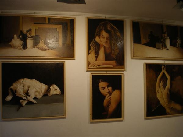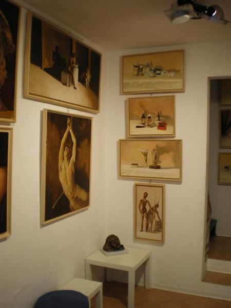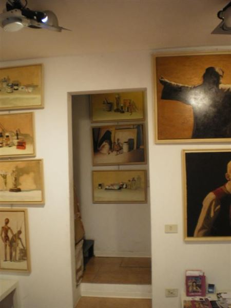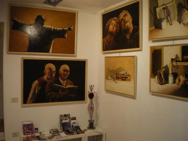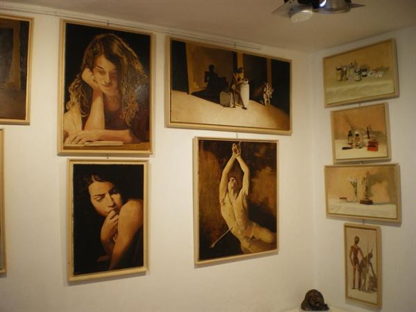 Un classico personalizzato si ritrova nei ricorrenti interni che ci immettono nel suo mondo creativo: lo studio, i manichini che lo rappresentano; tutto ruota intorno a questo concentrato d' idee e di sensazioni che da abile ed esperto maestro sistema sulla tela fino a raggiungere un effetto di dimensione scalanti ed accrescitive che qualificano una sua pittura di corale esistenzialità.
